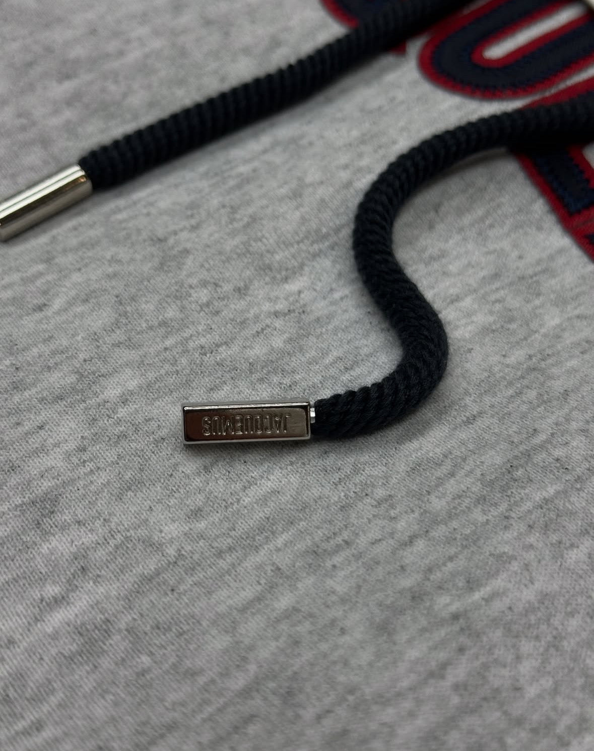 - The front of the hoodie has a two-tone logo patch embroidered with the brand name "JACQUEMUS".